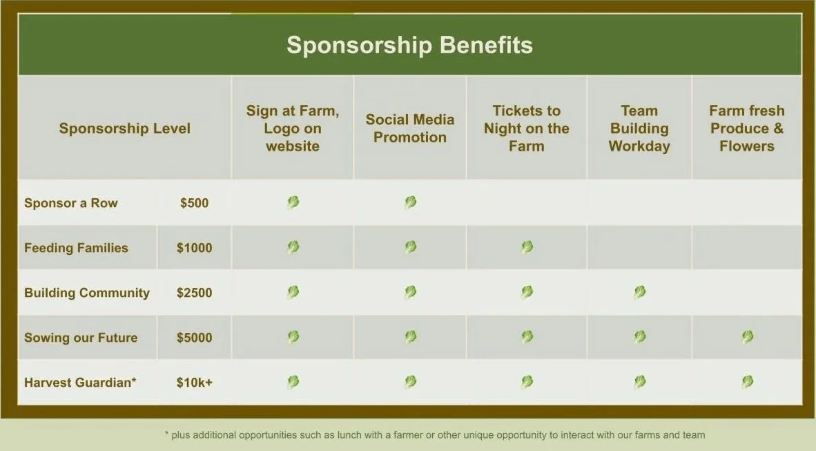 Sponsorship supports food production row by row by helping to cover the annual cost of farm materials including seeds, signs, soil amendments.